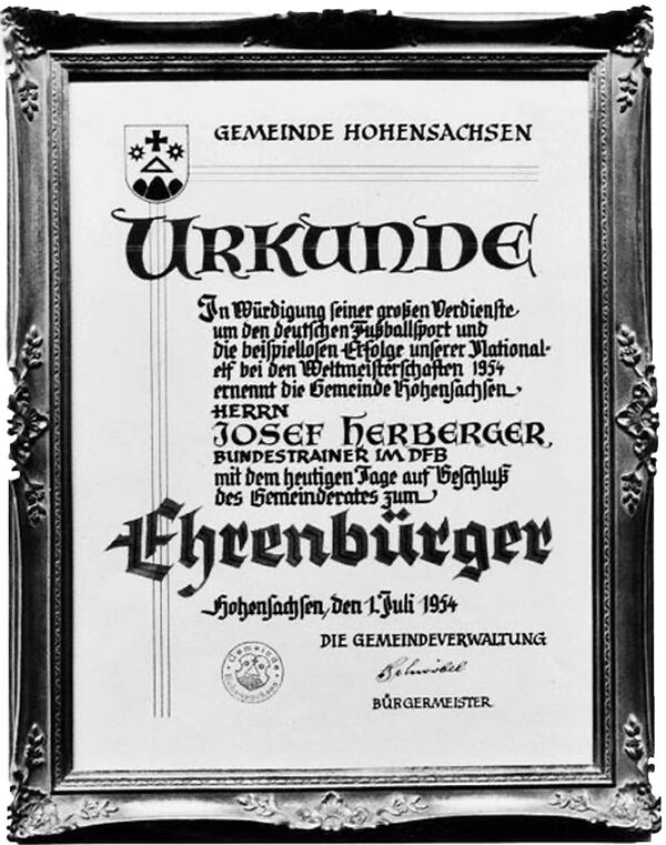Die Ehrenbürger-Urkunde überreichte Hohensachsens Bürgermeister Georg Schwöbel nach Herbergers triumphaler Heimkehr am 7. Juli 1954 im völlig überfüllten Saal des „Goldenen Ochsen” (heute griechisches Restaurant). Hier endete der Triumphzug, der am Nachmittag an der Ausfahrt Viernheim der alten Reichsautobahn (heute A 67) begonnen hatte, wo der Erfolgstrainer von seiner Frau Ev und Bürgermeister Schwöbel erwartet wurde. An der Ziegelhütte, dem damaligen westlichen Stadteingang (heute Karlsruher Straße), setzte sich eine Motorradstaffel der Weinheimer Stadtpolizei an die Spitze einer Wagenkolonne, die einer offener VW-Käfer mit Ev und Sepp Herberger und Bürgermeister Schwöbel anführte, gesteuert von Wilhelm Sebastian, in den 1930-er Jahren erfolgreicher Beifahrer von Rudolf Carraciola und Cheftechniker der Rennfahrer-Legenden Bernd Rosenmeyer und Tazio Nuvolari.