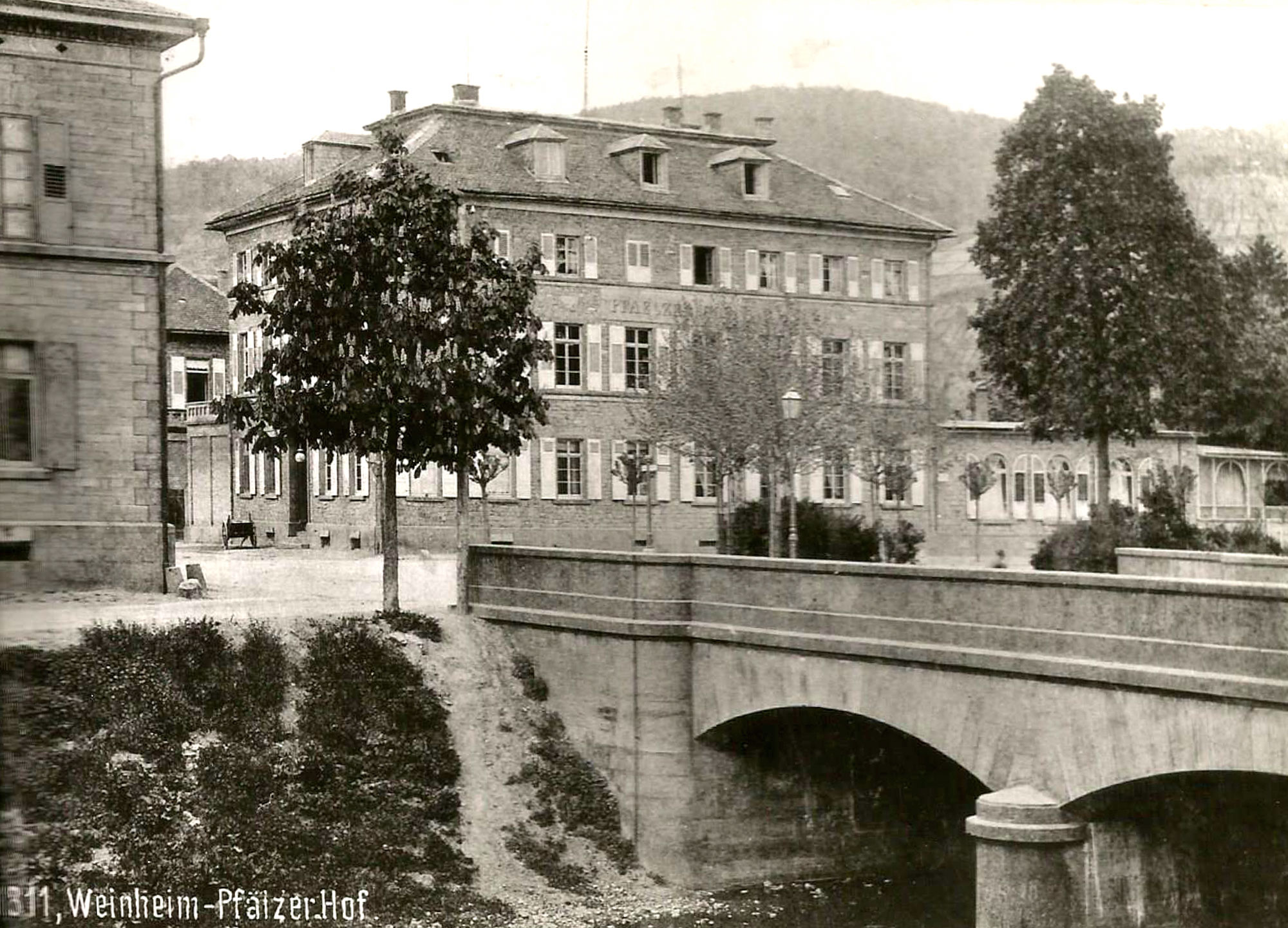 Simon Spitz war nicht der erste Bauinteressent an dem Gelände, auf dem er 1839 das Gasthaus „Zur Bergstraße“ errichten ließ, das zu einem unbekannten Zeitpunkt den Namen „Pfälzer Hof“ erhielt. Schon 150 Jahre zuvor gab es dort Bauinteressenten. Das hat Josef Fresin, der große alte Mann der Weinheimer Stadtgeschichte, beim Stöbern in den Ratsakten herausgefunden. Im Ratsprotokollbuch 13 entdeckte er Dokumente aus dem Jahr 1692, die sich mit dem Wunsch des Weinheimer Gastwirts Johann Meyer beschäftigen, eine neue Herberge zu errichten. Der Besitzer des Gasthauses „Schwarzer Adler“ (später Eisenhandlung Gunßer gegenüber der Peterskirche) hatte darum gebeten, „dass ihm ein Stück von dem gemeinen Allmendplatz jenseits des Bockstegs an der Landstraße zur Errichtung einer neuen Herberge mit Hofrecht unfern dem Gutleuthaus um billige Bezahlung überlassen werden möge“.
