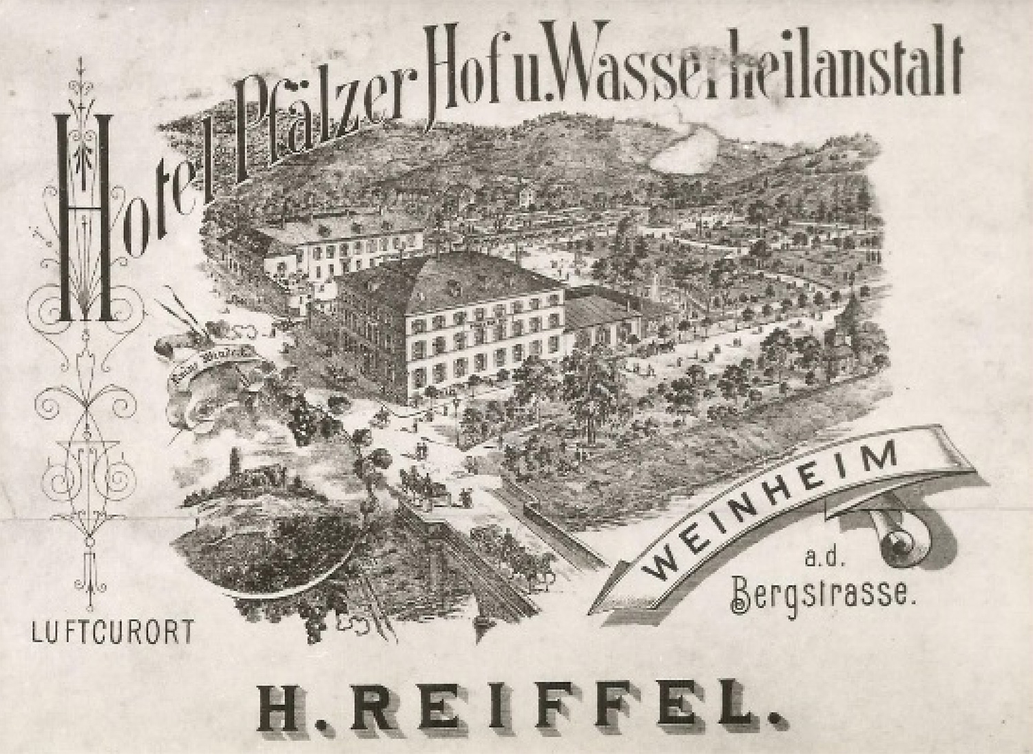 1870 erhielt der „Pfälzer Hof“ einen Stern im „Baedeker“, dem seit 1832 erscheinenden, bis heute beliebten und geschätzten Reiseführer. 1902 brachte der Leipziger Verlag die 29. Baedeker-Ausgabe unter dem Titel „Rheinlande von der Schweizer bis zur holländischen Grenze“ heraus. Die Route 3 dieser Ausgabe beschrieb die Bergstraße zwischen Frankfurt und Heidelberg. Erste Weinheim-Information im Baedeker war der Hinweis auf die „drei wichtigsten Gasthäuser“: „Pfälzer Hof“ (Reiffel), altbekanntes Haus mit großem Garten, 36 Zimmer zu 1½ bis 2 Mark, 2 Personen 4½ bis 5 Mark, „Vier Jahreszeiten“ in der Stadt, „Prinz Wilhelm“ am Bahnhof. 123 Jahre später besteht keines der einst führenden Häuser Weinheims mehr: auf dem Areal des „Pfälzer Hof“ und seiner Festhalle steht heute die Stadthalle, in den Mauern der „Vier Jahreszeiten“ ist das Kaufhaus Birkenmeier gewachsen (heute Weinheim-Galerie) und das Hotel „Prinz Wilhelm“ wurde erst Finanzamt und ist heute das Dienstgebäude des Polizeireviers Weinheim.